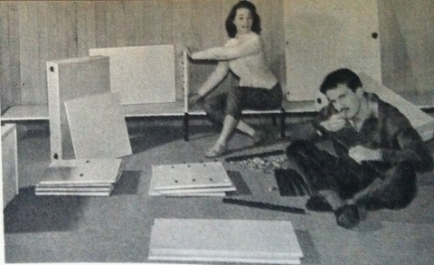 Et rigt udvalg af moderne kombinationsmøbler, bestående af hylder, skabe, skuffer, klapborde m.m., bl.a. et sæt møbler, man kunne bestille tilsendt i papkasser og så selv male dem.